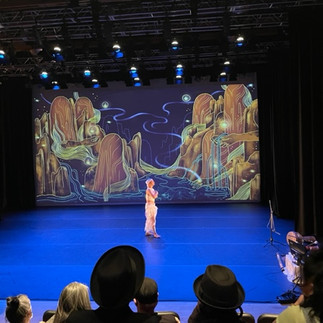 A magical world awaited inside, created by visual artist Malaya Tuyay and set designer Stephanie Gancayco. The back wall glowed with a vivid landscape of round brown and gold hills, through which a moving stream cut, against a mystical sky full of twinkling stars rendered in the painterly style of a batik. In a front corner of the stage was an altar of sorts, including traditional brooms, fans and furniture and old photos of people from the Philippines.